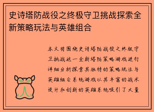 本文将围绕《史诗塔防战役之终极守卫挑战》这一全新塔防策略游戏进行详细分析,探索其独特的策略玩法与英雄组合系统。游戏以其丰富的战术设计和创新的英雄系统吸引了大量玩家,在玩家的防守与攻防之间,游戏不仅考验玩家的即时反应能力,还鼓励玩家深思熟虑地选择合适的英雄和塔防策略。本篇文章将从四个方面详细阐述游戏的核心玩法:一是“终极守卫挑战的创新设计”,二是“塔防策略的多样性”,三是“英雄组合的深度分析”,四是“游戏的长期吸引力与挑战性”。通过深入剖析这些内容,玩家能够更好地理解游戏的深度并享受其中的策略乐趣。